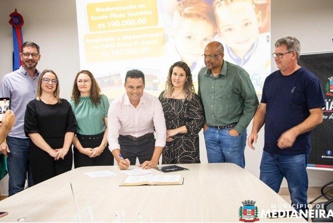 Dentro das ações comemorativas de 64 anos de Medianeira foram assinadas as ordens de serviço para modernização da Escola Plinio Tourinho e Cmei Silvia Pereira Donel.